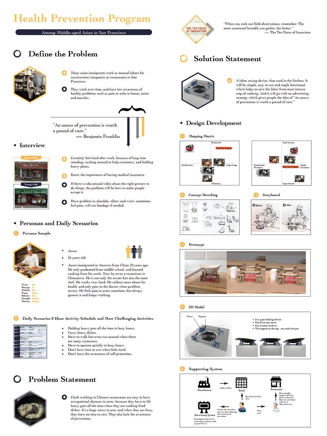 Chefs working in Chinese restaurants were easy to have occupational diseases in arms, because they have to frequently lift heavy pots. It was a huge stress in arms, and when they were busy, they have no time to rest.The proposed design was a labor saving device. It was simple, easy to use and single functional, which helps to save the labor from most intense step of cooking. It